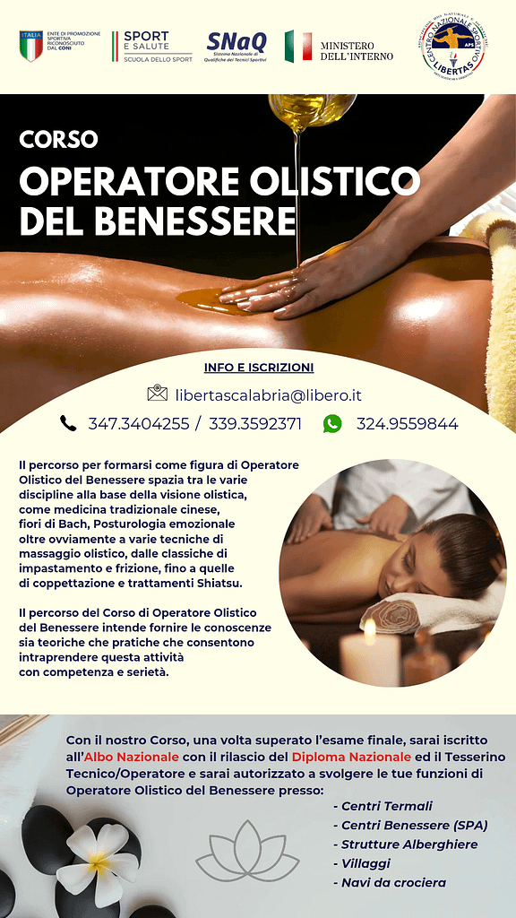 Alla fine del tuo percorso formativo, con il superamento dell’esame finale, sarà rilasciato al corsista Diploma di valenza Nazionale certificato dal Centro Nazionale Sportivo Libertas riconosciuto dal CONI e dal Ministero dell’Interno nel Settore Discipline Olistiche e Bionaturali, con il titolo di Operatore Olistico del Benessere, oltre al rilascio del Tesserino Tecnico/Operatore che lo abilità a svolgere le proprie competenze ed all’iscrizione all’Albo Nazionale nel Settore di appartenenza.